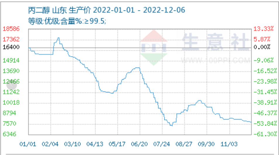 اعتبارًا من 6 ديسمبر 2022، بلغ متوسط سعر المصنع لبروبيلين جليكول الصناعي المحلي 7766.67 يوان/طن، بانخفاض قدره 8630 يوانًا أو 52.64٪ عن سعر 16400 يوان/طن في الأول من يناير.